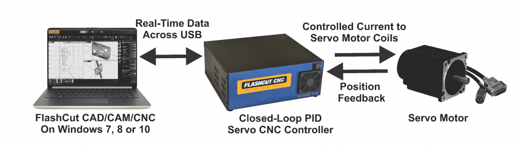The FlashCut Software running under Windows is the CAD/CAM interface and CNC operator control panel.   It processes all of the real time graphics and user interface commands.  It sends motion commands to the CNC Controller over a high speed USB connection. Since Windows is NOT a real time operating system, FlashCut sends all of the motion commands to the CNC Controller over a Hi-Speed USB link to reliably process all of the real time motion.