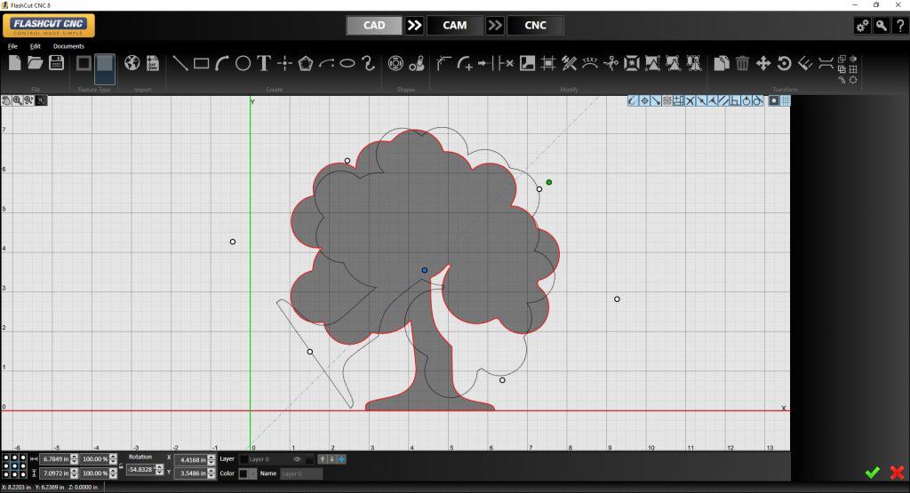 Any objects or set of objects in FlashCut CAD can be stretched, positioned, or rotated by manipulating a set of control points with the cursor, or by entering values using the toolbar.