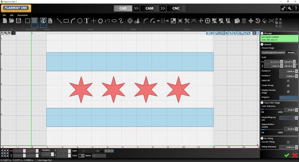 This tool creates geometry for a drawing from a source image based on color. Boundaries between different colors define where the lines are drawn. Each new color is placed on a unique layer, which is color-coded and can be nested.